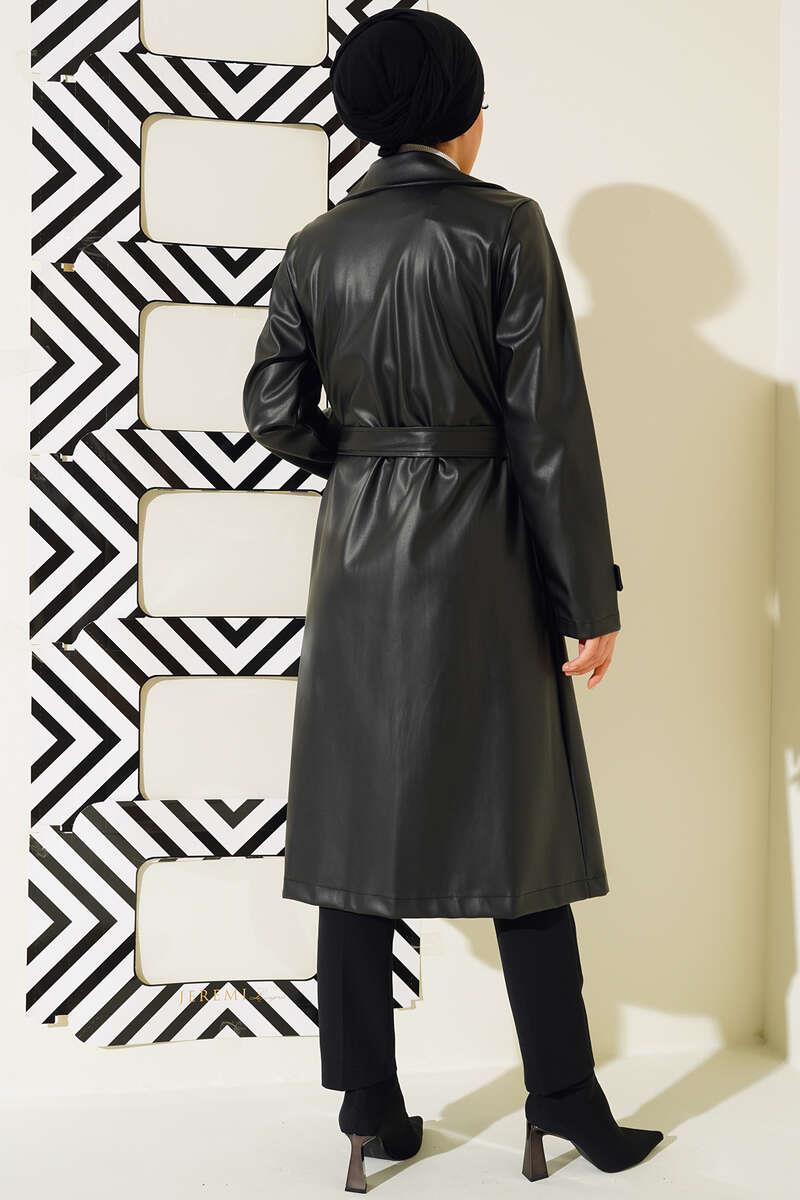 Tek Düğmeli Kemerli Deri Trençkot Siyah (0999-3607-23-462623)